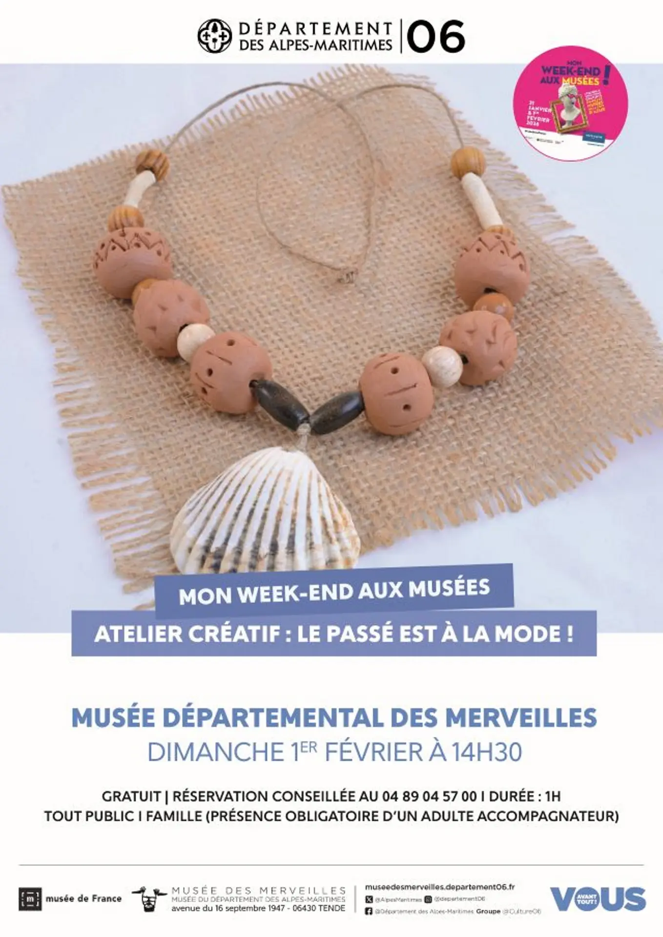 Ton, einige Muscheln, Perlen und ein Stück Schnur, um an das Kunsthandwerk der Vorgeschichte zu erinnern. In diesem Workshop können Groß und Klein eine Halskette herstellen, indem sie die Rohstoffe aus der Jungsteinzeit verwenden.